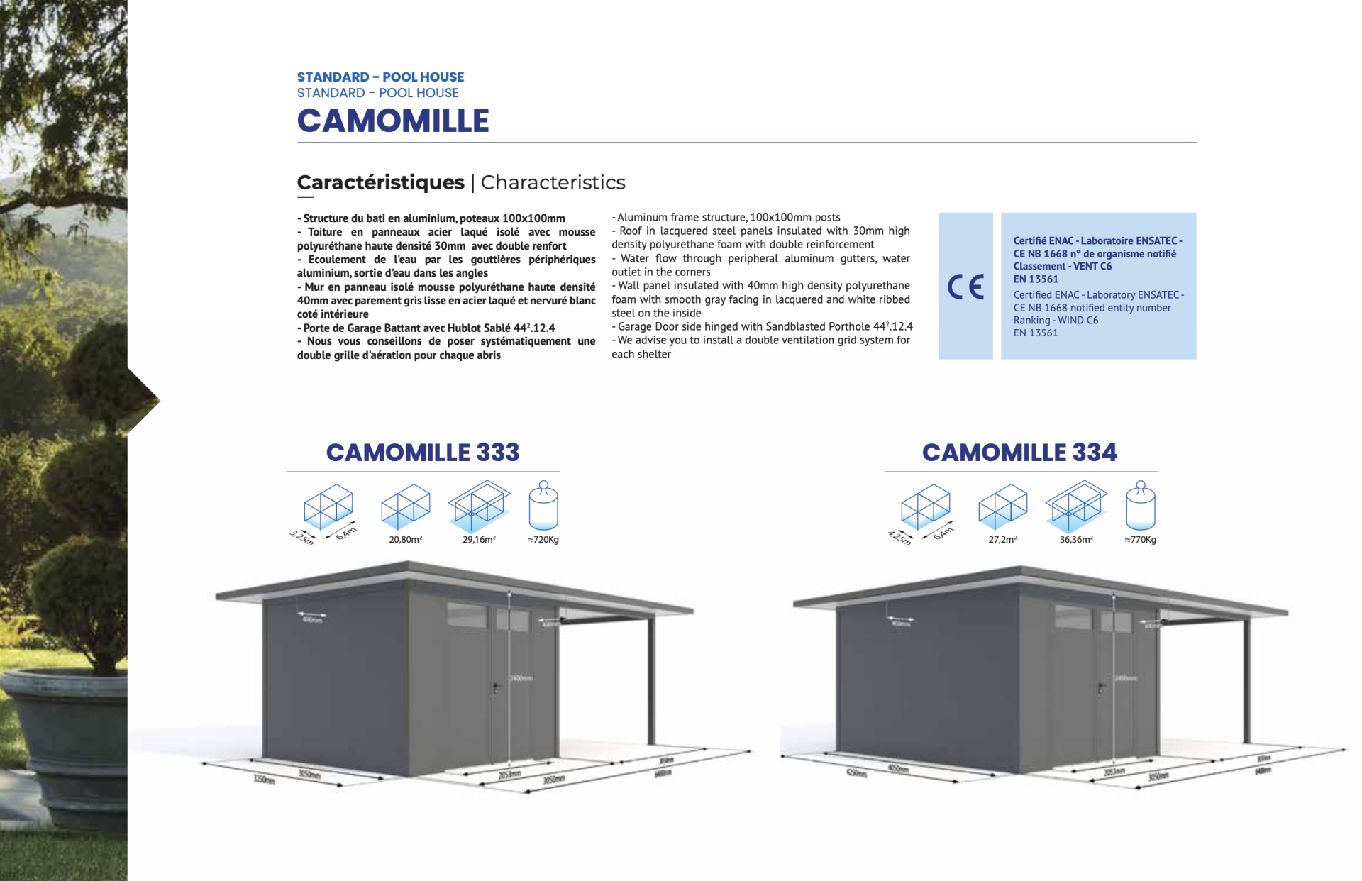 La structure du bâti est en aluminium, la toiture en polycarbonate ou en panneaux isolés selon le modèle. Les parois des abris Spa sont composées de 4 coulissants 4 vantaux, celles du Pool House sont en panneaux isolés avec la possibilité de le composer sur mesure dans des modules de 3 x 3 M.